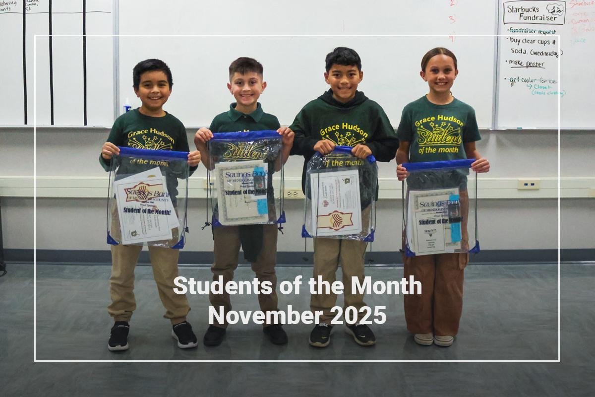 Applauding our Grace Hudson Students of the Month: Alan Ceja-Valencia, Chase Thompson, Nael Lemus Sandoval, and Leona Summers. Great job, Hawks!